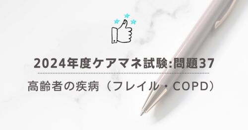 2024年度ケアマネ試験 ☆☆☆☆☆☆☆☆☆☆☆☆☆☆☆☆☆☆☆☆☆☆ 問題37 次の記述のうち適切なものはどれか。3つ選べ。 1.後期高齢者に対する健康診査では、フレイル状態のチェックも重要である。 2.握力の低下は、サルコペニア (筋肉減弱症)の目安となる。 3.慢性閉塞性…