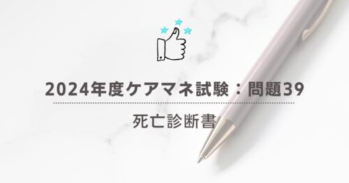 2024年度ケアマネ試験 ☆☆☆☆☆☆☆☆☆☆☆☆☆☆☆☆☆☆☆☆☆☆ 問題39 死亡診断書を交付することができる資格として正しいものはどれか。2つ選べ。 1.介護支援専門員 2.介護福祉士 3.医師 4.歯科医師 5.薬剤師 ・ ・ ・ ・ ・ 答え:3・4 解説: 1…誤り。 介護支…