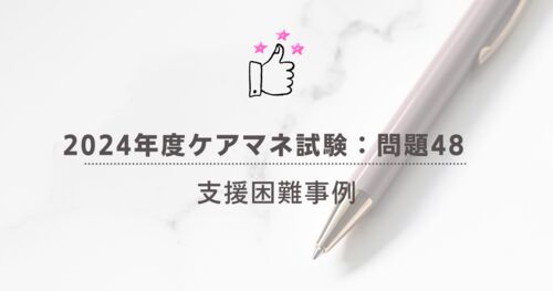 2024年度ケアマネ試験 ☆☆☆☆☆☆☆☆☆☆☆☆☆☆☆☆☆☆☆☆☆☆ 問題48 ソーシャルワークの視点から、支援困難事例に関する記述として、より適切なものはどれか。3つ選べ。 1.高齢者の家族が支援内容に対して何度も不満を訴えたため、担当の介護支援専門員が地域包括支援…