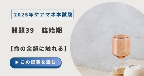 2025年ケアマネ本試験問題 ☆☆☆☆☆☆☆☆☆☆☆☆☆☆☆☆☆☆☆☆☆☆ 問題39 臨死期の徴候について、より適切なものはどれか。3つ選べ。 1. 規則正しいリズムの呼吸 2. 意識レベルの低下 3. 四肢冷感 4. 尿量増加 5. 喘鳴 ・ ・ ・ ・ 解答2・3・5 【解説】 1…適切でな…